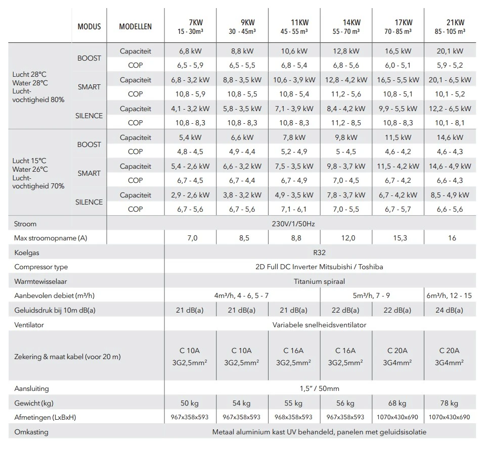Door deze technologie ligt de COP waarde gemiddeld tussen de 6 en 11. Dit bij een luchttemperatuur van 28°C en een watertemperatuur van 28°C.