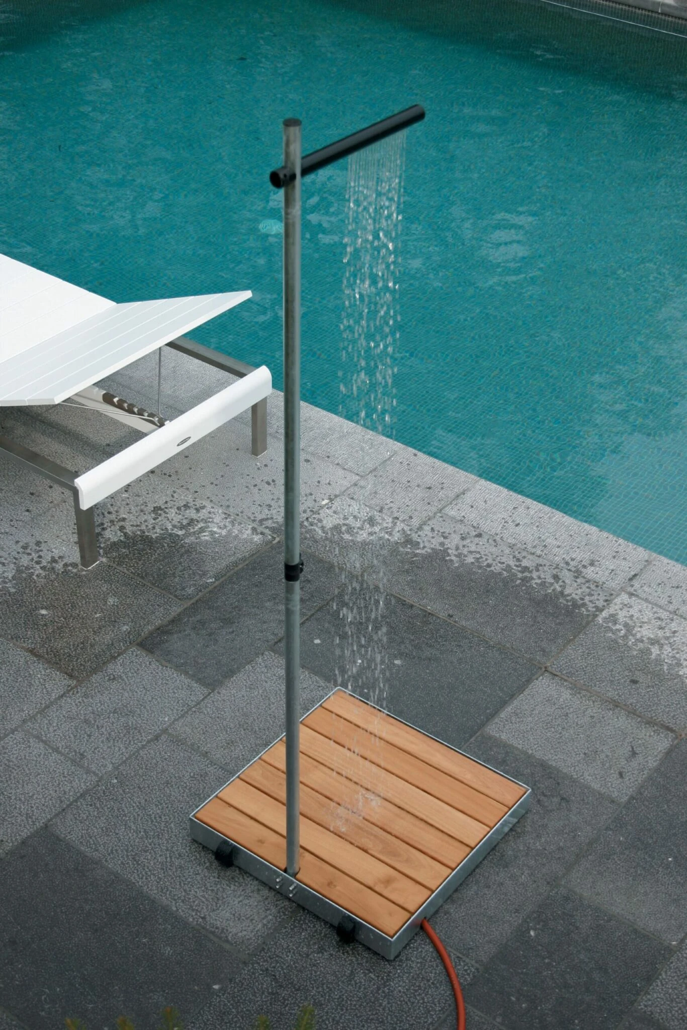 De Cascade douche is volledig handgemaakt in warm verzinkt metaal. De hardhouten acacia latten van de sokkel zijn duurzaam en antislip. Een kraantje op de verticale buis laat u toe het debiet te regelen en de horizontale staaf bovenaan is een lineaire sproeikop in zwarte nylon.