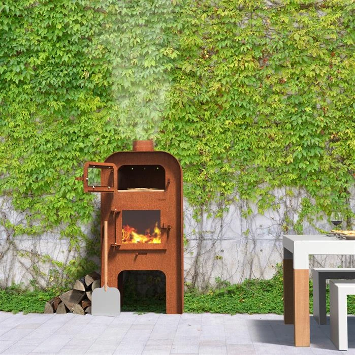 - Een tuin kachel met pizzaoven en met dubbelwandige vuurkamer