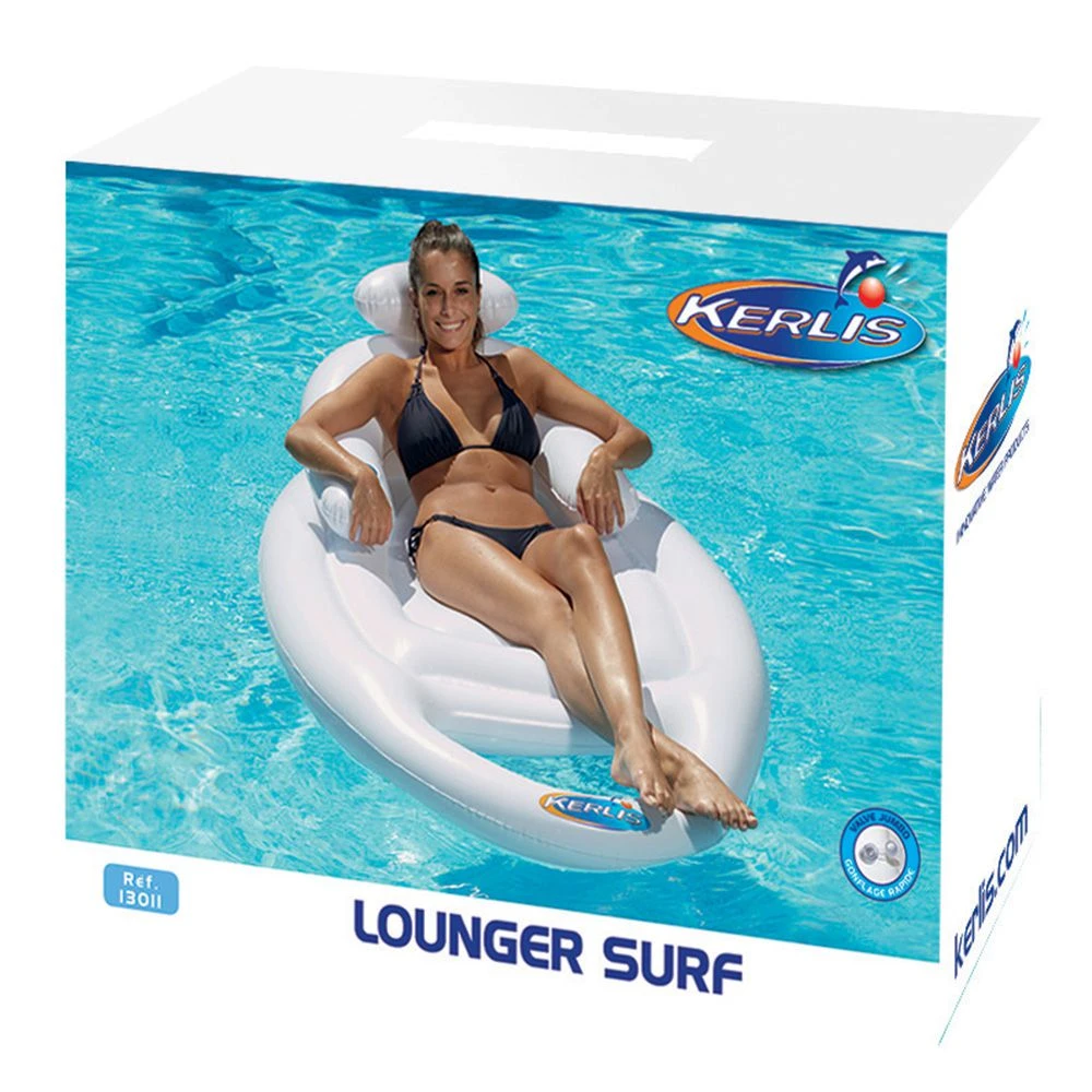 Grote surf drijvende lounge zetel in witte kleur. Zeer strak, handig en uitermate kwalitatief. Er is een extra bekerhouder, stevige hoofd en rugsteun. De opblaasbare lounge zetel is gemaakt van versterkt dikker PVC 0,35 mm. Doorgaans is de dikte van het opblaasbaar speelgoed 0,2 mm dik.