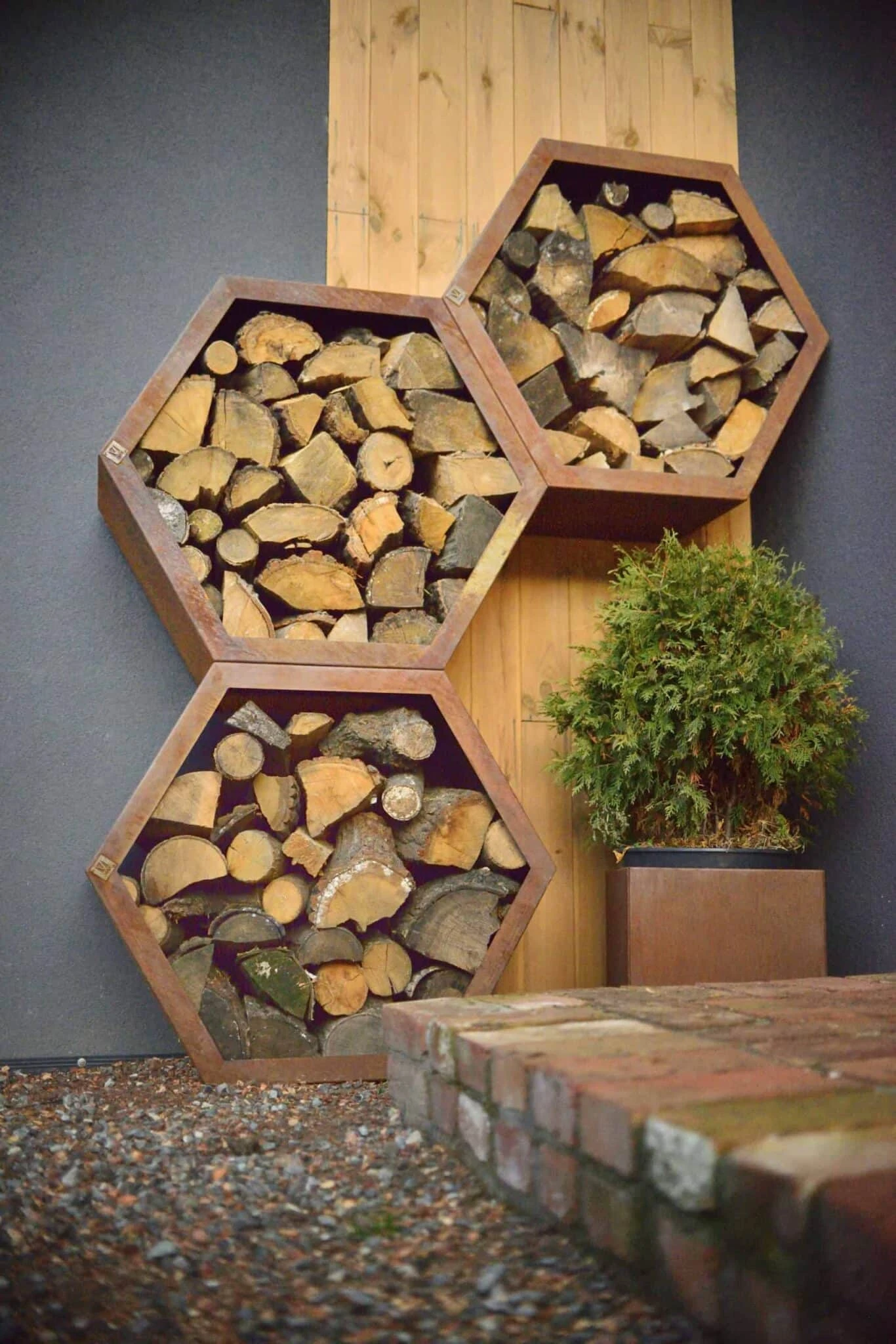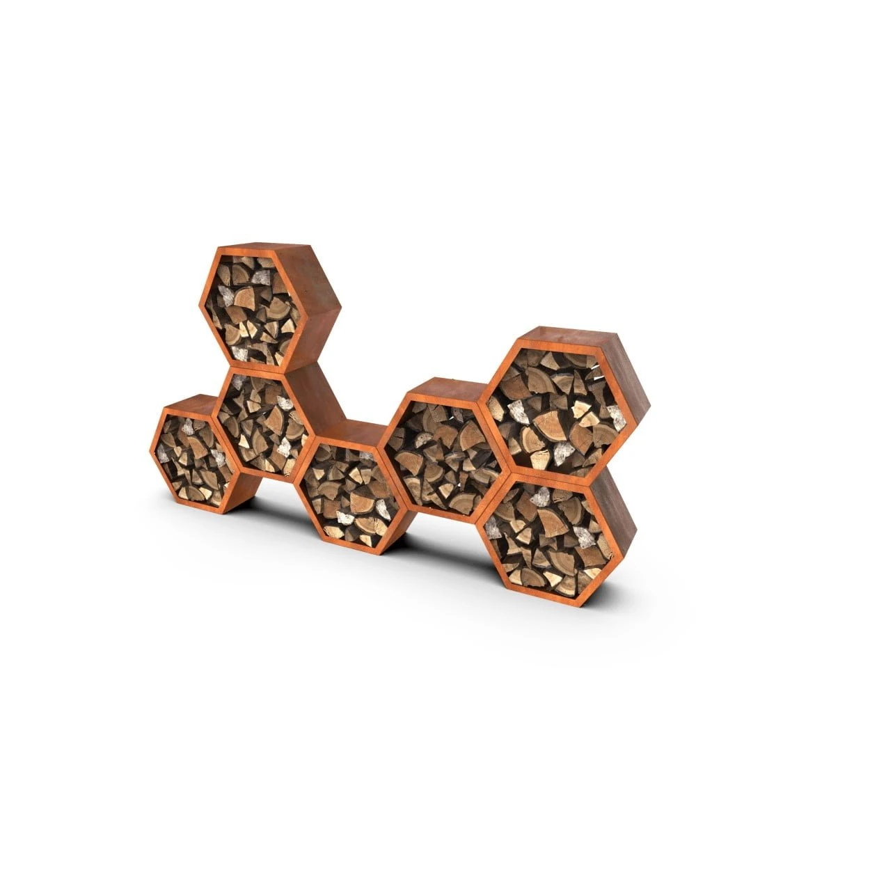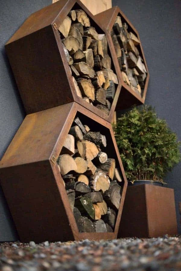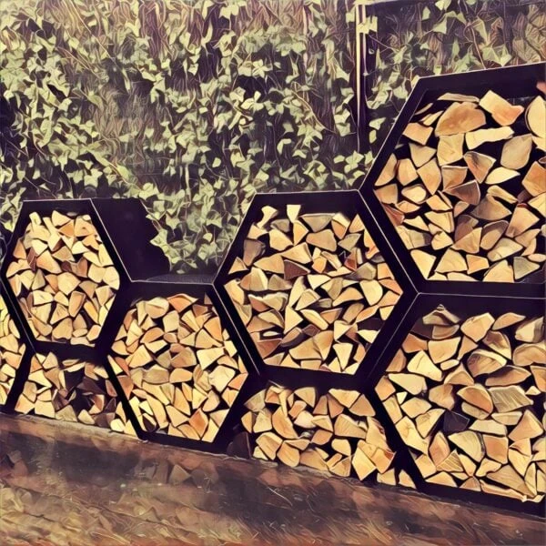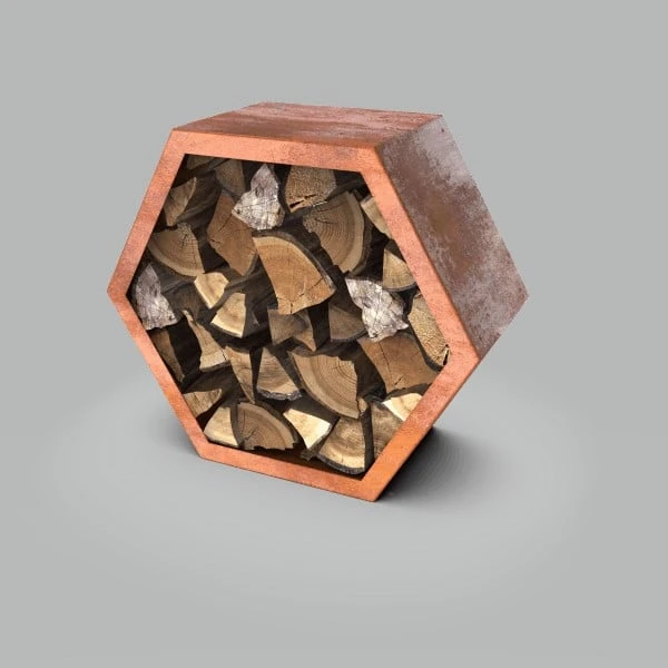Deze stalen honingraat structuur is moduleerbaar en te krijgen in geroest staal of zwart gepoederlakt. Naast het gebruik voor de opslag van brandhout kan deze structuur ook gebruikt worden als tuinberging in het algemeen, maar bijvoorbeeld ook als brievenbus of als insectenhotel.