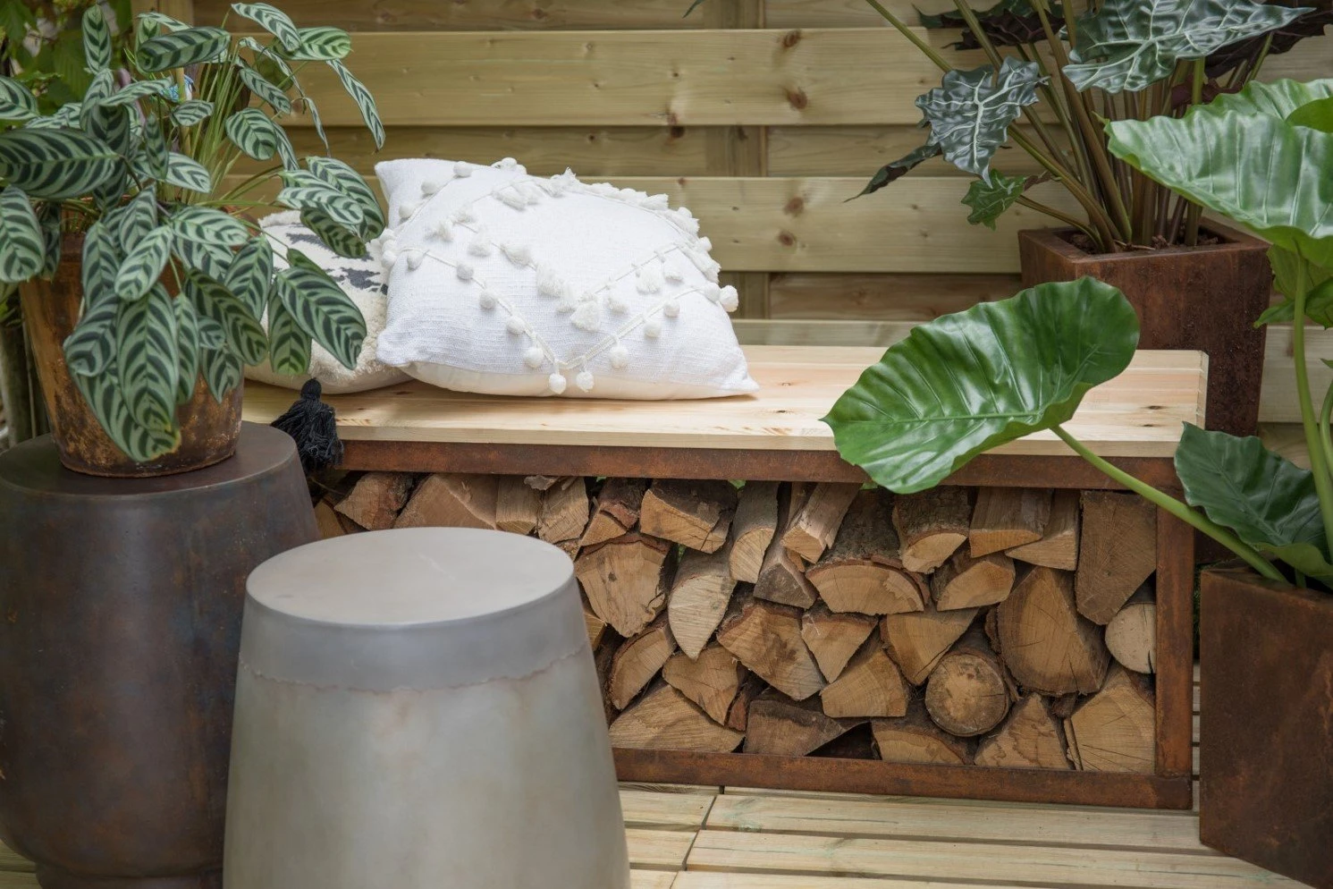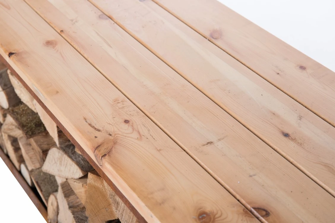 Houtopslag bank voor in de tuin in premium staal die werd geroest. Het frame is 3mm dik staal. Afgewerkt met gladgeschuurd houten planken zitting. Mooi te combineren met onze Stapelbare houtopslag boxen.