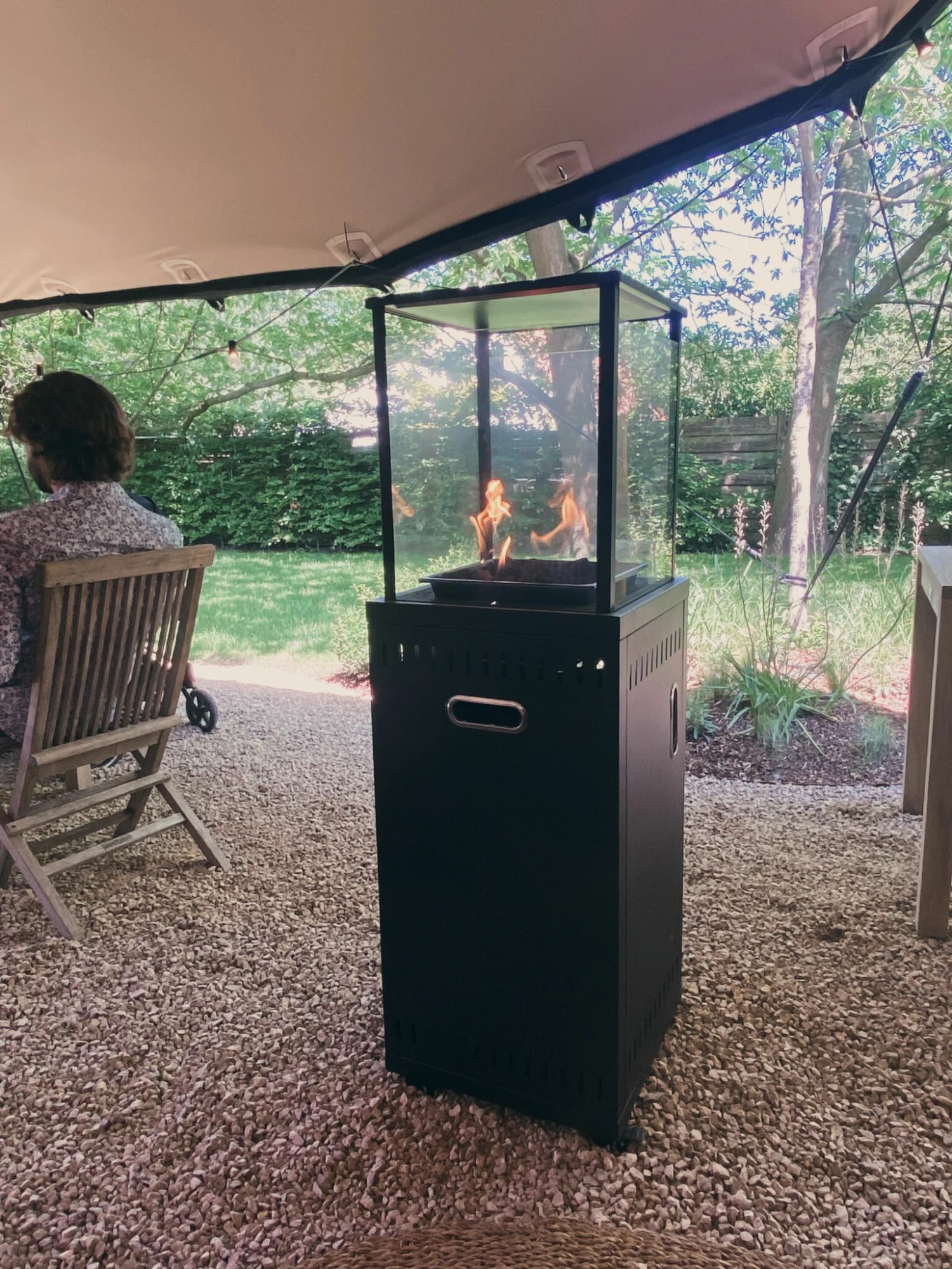 Ibiza gashaard garden fire met groot vermogen van 9000 Watt. Geschikt voor het verwarmen van overdekte terrassen of in een open poolhouse. Horeca kwaliteit gasverwarming voor op terras in de tuin. Rondom warmte en gezelligheid door glas ramen aan 4 zijden.
