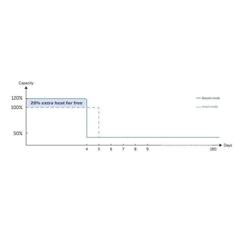 Bij opstart zal de warmtepomp aan 120% van zijn capaciteit draaien om snel de gewenste zwembadtemperatuur te bereiken - Smart modus