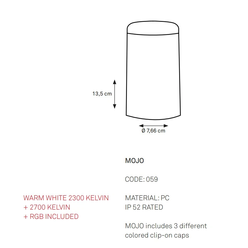Mojo tafellamp van Imagilights voor binnen en buiten. Vervaardigd uit PC (Polycarbonaat). Onbreekbaar, shock resistent, waterdicht en UV resistent. Geschikt voor privé of professioneel gebruik. Iedere Mojo LED tafellamp wordt geleverd met 3 gekleurde kapjes, zwart – groen – zand kleur.