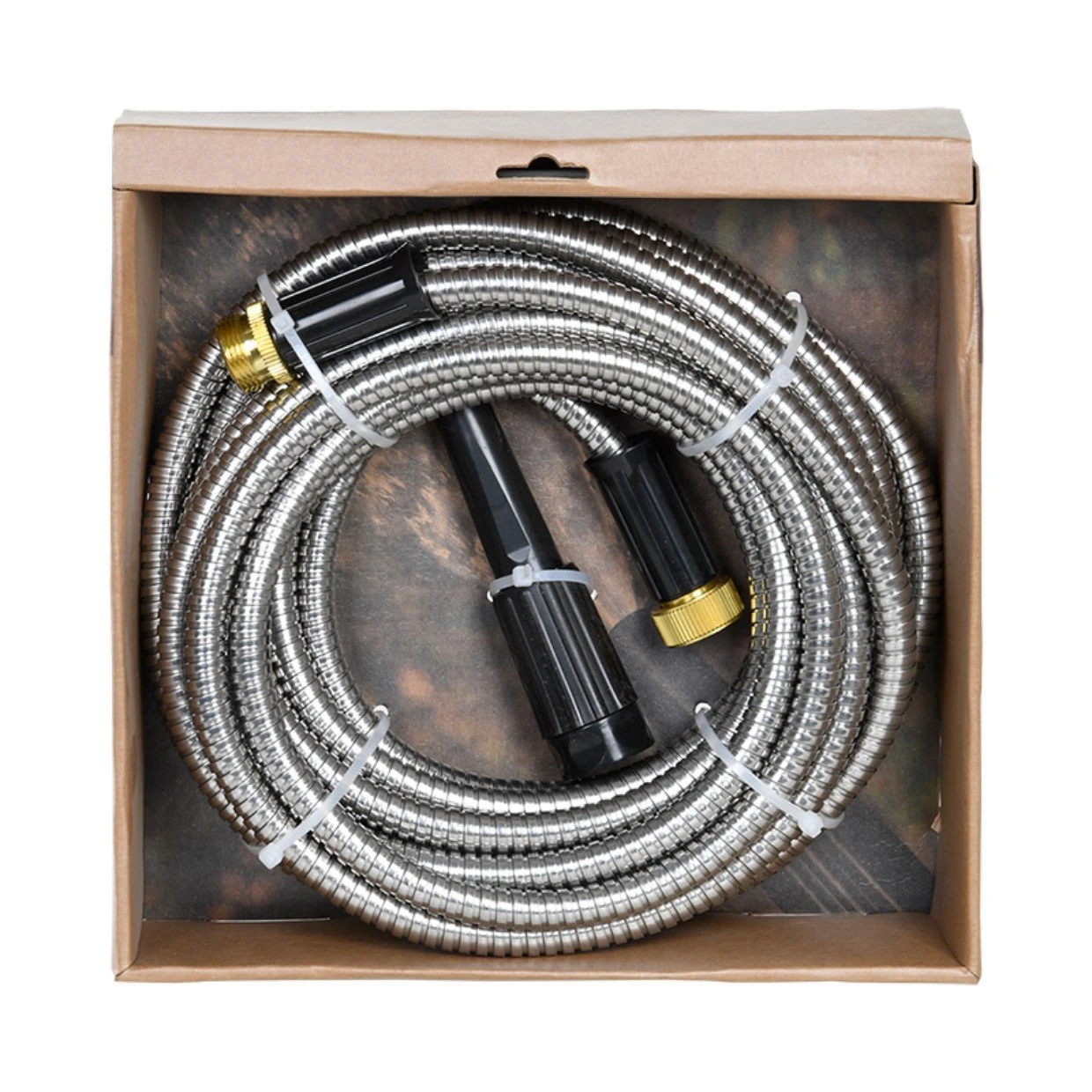 RVS Design tuinslang 10m lang, zeer robuuste tuinslang. Knikt niet, kan niet doorprikt worden door doorns en is ongevoelig voor vorstschade. Inclusief zwart regelbaar spuitstuk.