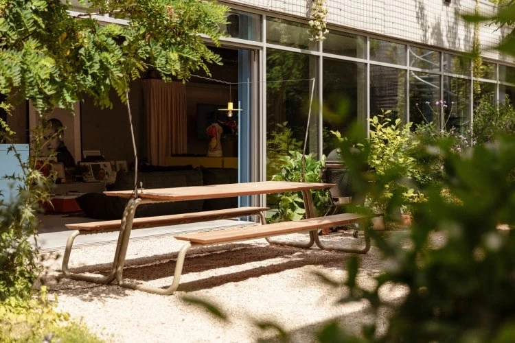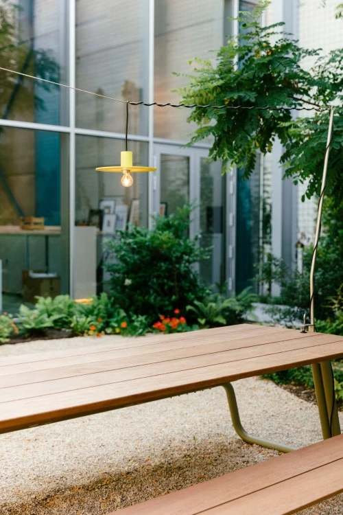 The disk designlamp voor buiten met meegeleverde staalkabel & tafel statief. Past op tuin tafels van verschillende lengte. Waterdichte lamp voor gebruik in de tuin, op terras of in het poolhouse.