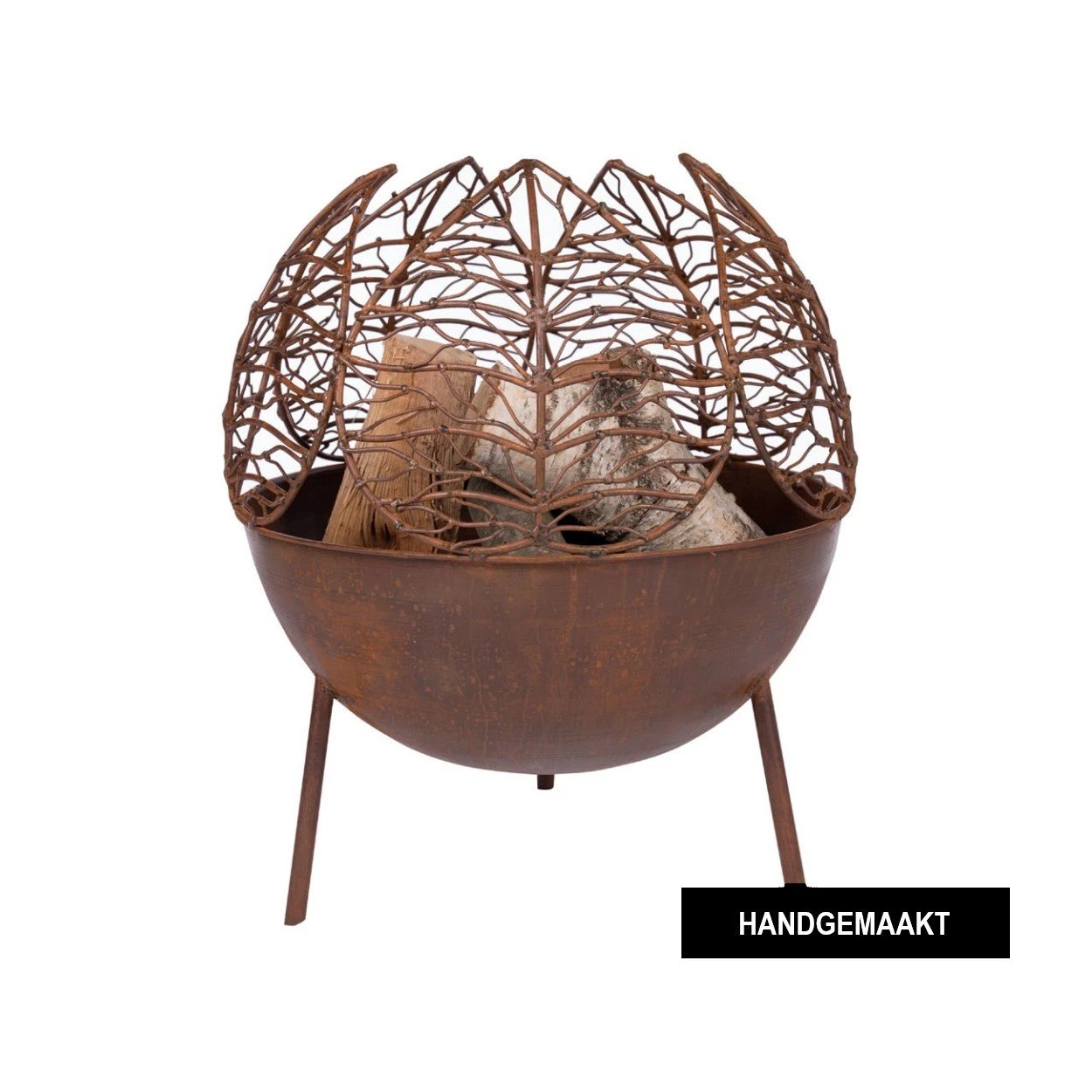 Handgemaakte Narfi Vuurbol in staal die natuurlijk roest. De bladvormige metalen zijkanten zorgen voor een prachtig design en een wondermooi lichtspel in het donker.