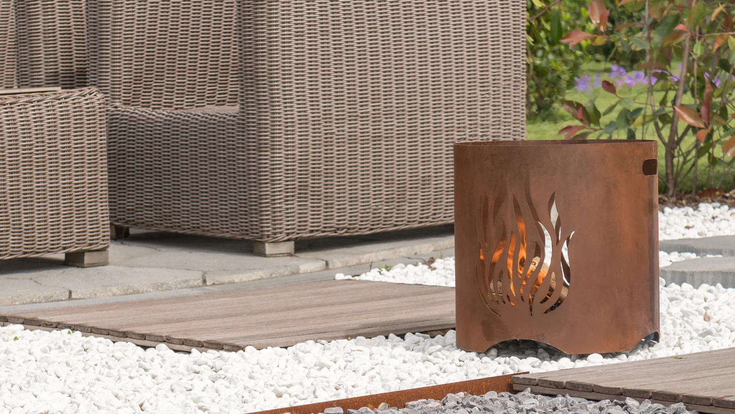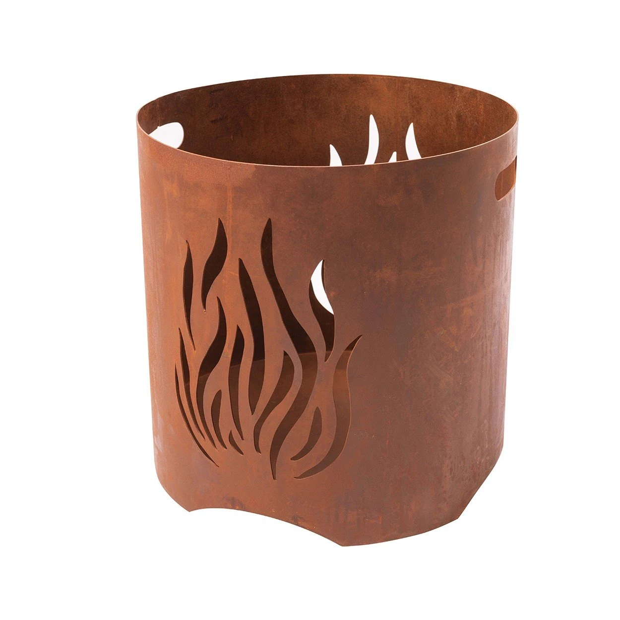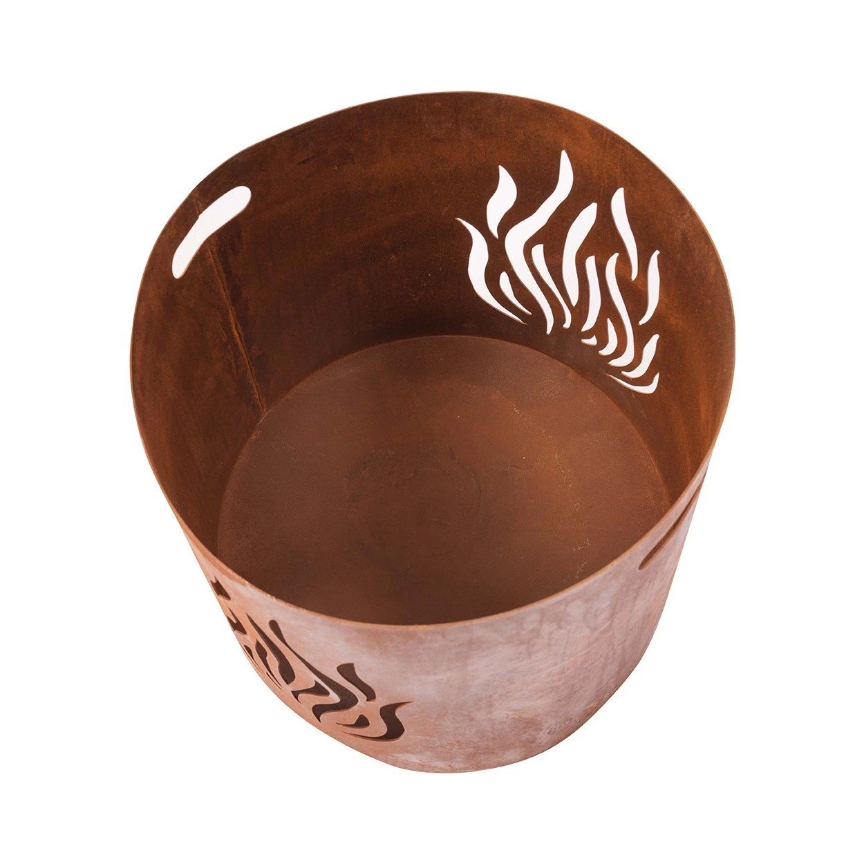 De uitsparingen in de vorm van vlammen zorgt voor een leuk lichtspel maar ook voor goede aanvoer van zuurstof en dus een goede verbranding. Tegelijk is deze vuur mand dus functioneel en ook zeer mooi en sfeervol. Weegt slechts 7kg en dus eenvoudiger te verplaatsen dan bv vuurschalen.
